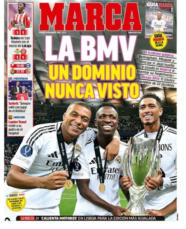 不知罗德里戈自己怎么看,他背后的亲友、助手是真替他感到委屈。就说欧洲超级杯夺冠后,《马卡》报在头版登出了姆巴佩、维尼修斯和贝林厄姆三人捧杯的照片,这其实也没什么,问题在于这张照片本来是四人合照,边上还有罗德里戈,结果却被《马卡》小编生生裁掉!而在欧超杯赛前前瞻,《阿斯》报的头版也是BMV在训练场的同框照片,标题是:“梦寐以求的三叉戟”!